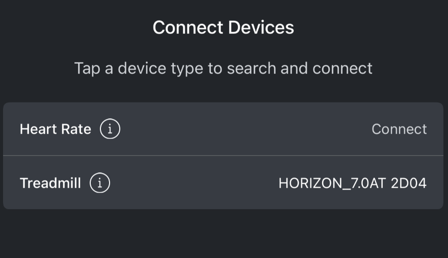 From your Peloton app, begin any Tread class and select the "Connect a Bluetooth® Device" option. Select your Horizon Studio Series treadmill from the "Connected Devices" list. A green checkmark will appear on the screen when the connection is made